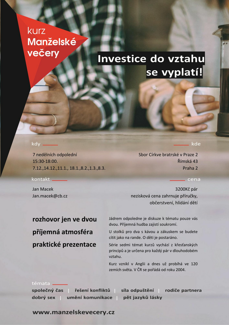Manželský večer uskutečníme odpoledne, abychom umožnili účastnit se rodičům menších dětí. Zajištěné bude i jejich hlídání. Večeři proto nahradíme kávou se zákuskem.