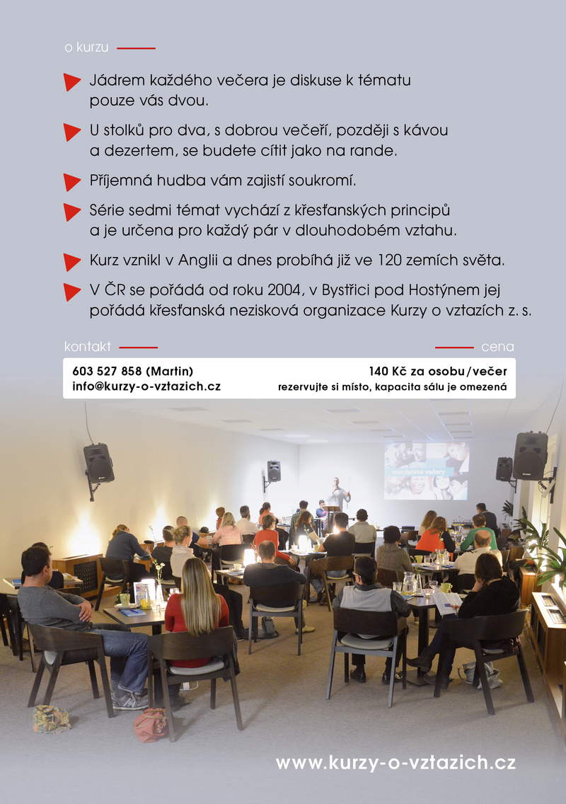 Jedná se o 7 setkání, kdy každý večer je složen následovně: večeře, úvod, video k tématu (mluví odborníci), práce s příručkou a diskuze ve dvou, tematicky určeno pro každého kdo žije v partnerském vztahu (ať už je sezdán či nikoli) a má zájem tento vztah opečovávat či vylepšovat.